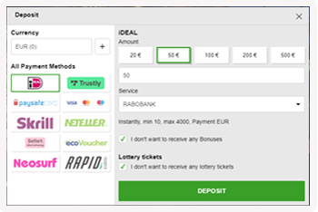 Nu is het tijd om geld te storten. Dit gaat heel erg makkelijk. Je hoeft alleen je betaalmethode, het bedrag dat je wilt storten en je bank te selecteren. Vervolgens klik je op de groene knop met de tekst ”deposit” erop. De rest wijst zich vanzelf.
